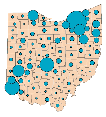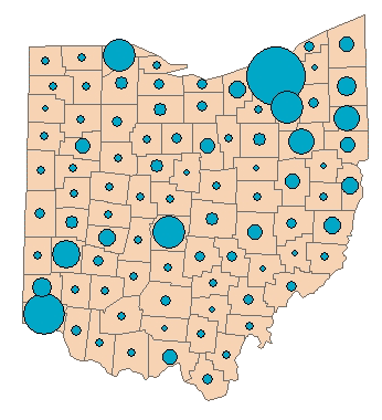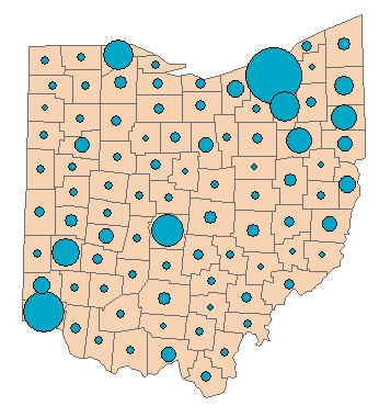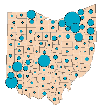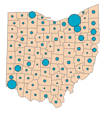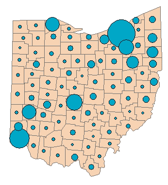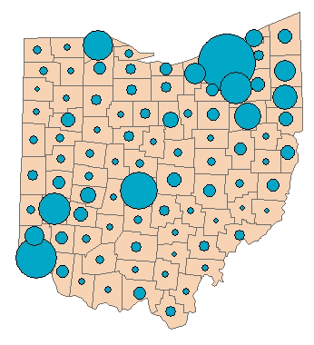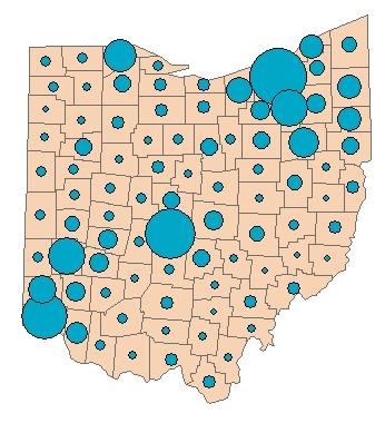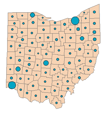 Proportional Symbol MapsThese maps show population totals in each county as proportionally-sized circles. Each circle is a different size based on the population of the county it represents. Since the size of each circle is relative to the other circles on a given map, there is no constant scale for all eleven maps, so these maps are not animated.