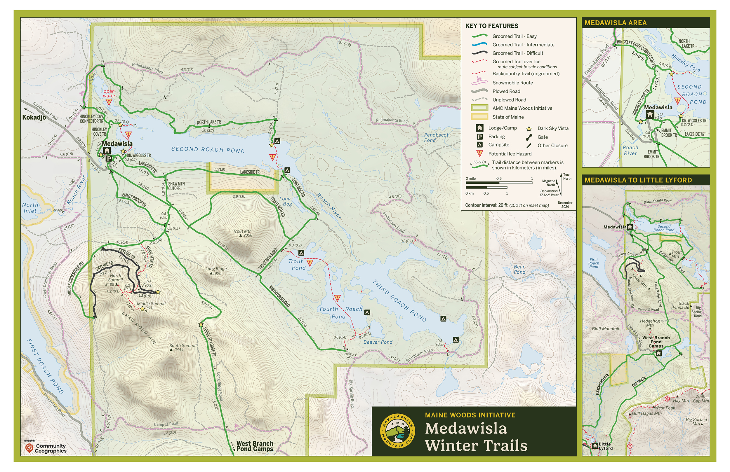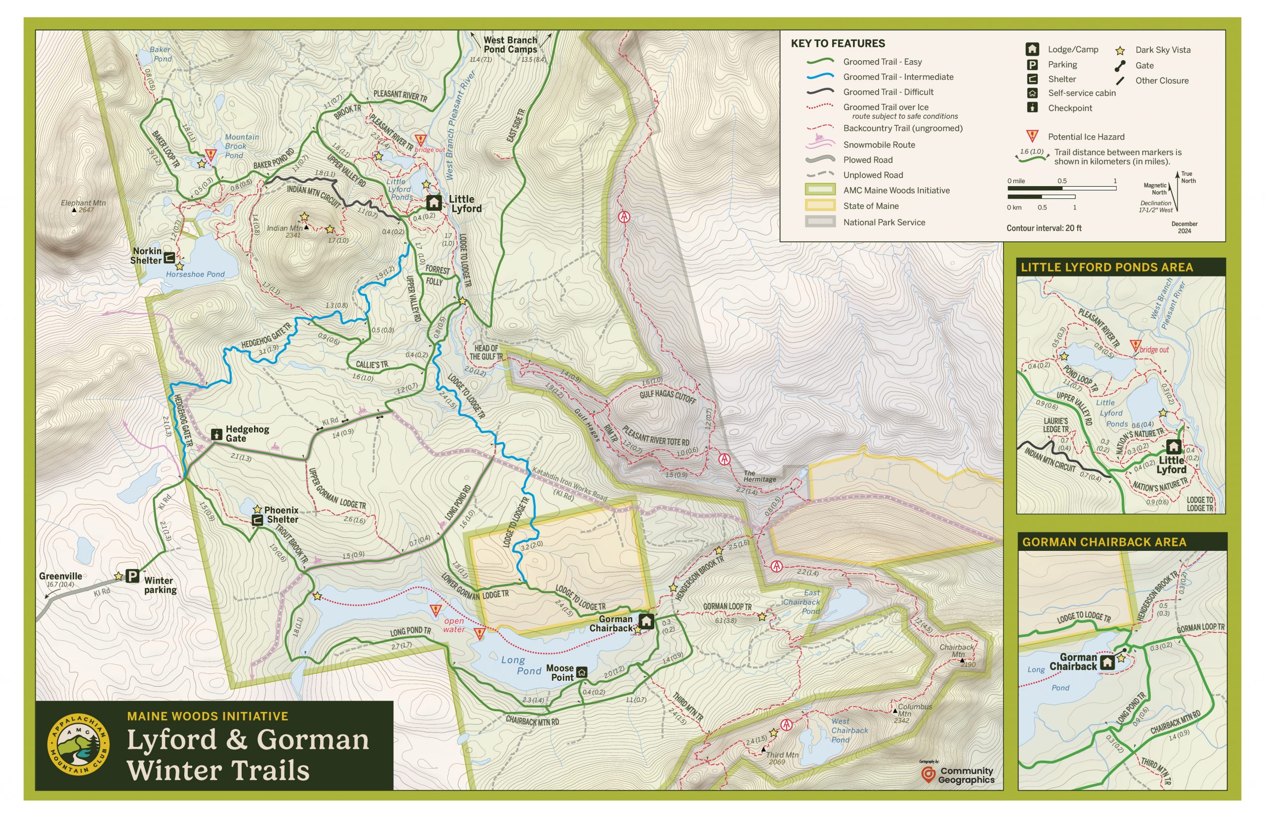 Community Geographics has been supporting a recreational inventory in the area, and has produced trail maps including redesigned winter trail maps that I helped with last year. The existing trail maps are pairs focused on the trails around the lodges with inset maps showing connections between the two areas.