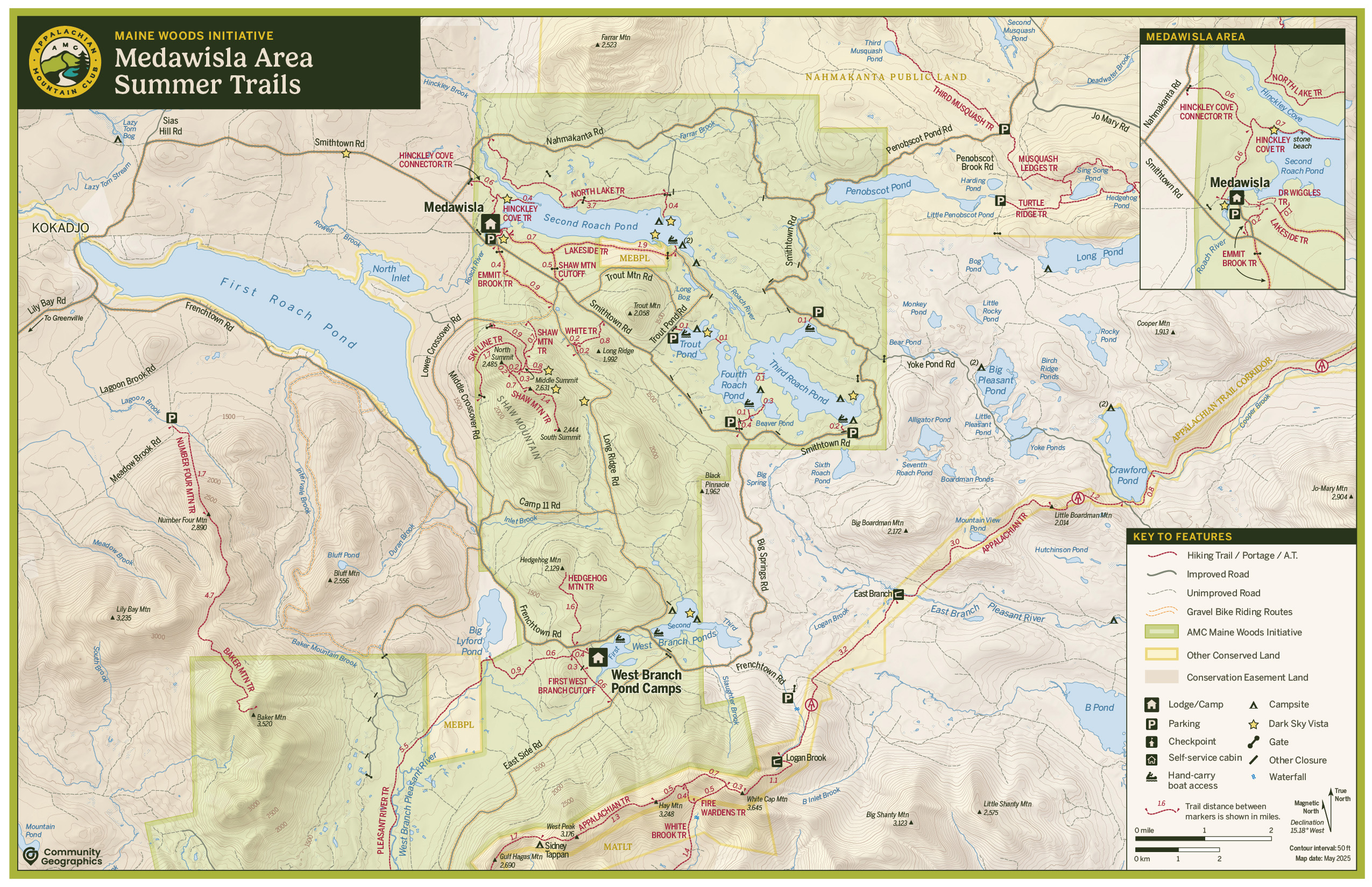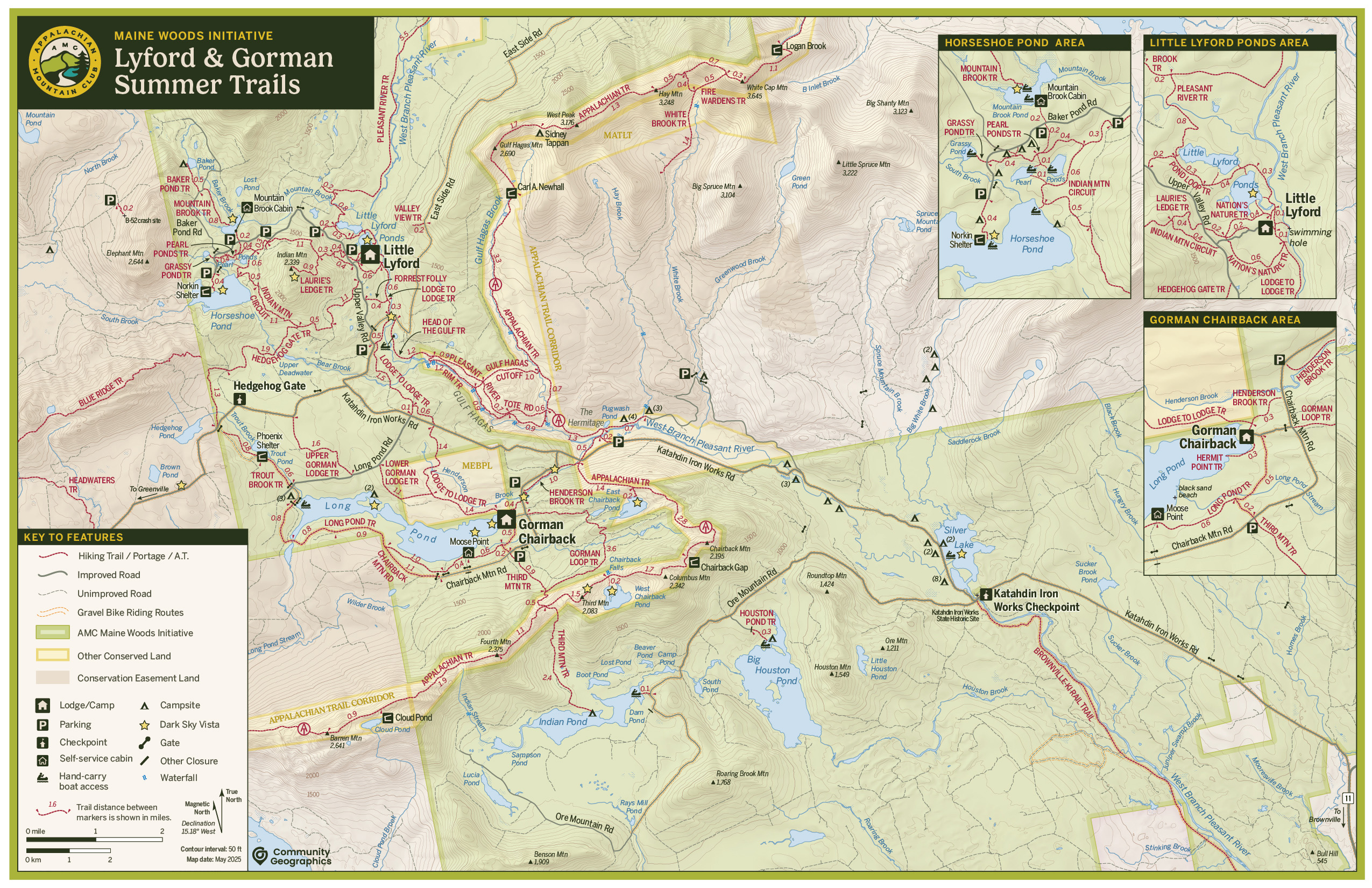 AMC's Maine Woods Initiative is a large recreation and land conservation endeavor in, well, the Maine Woods around the (in)famous 100-Mile Wilderness along the Appalachian Trail. To date, AMC has acquired nearly 130,000 acres in the region for permanent protection. AMC's properties include three lodges and some 130 miles of trails for use both in summer and winter.